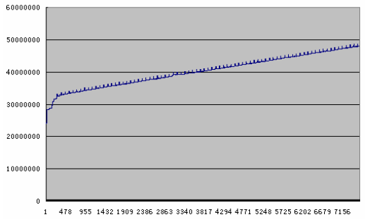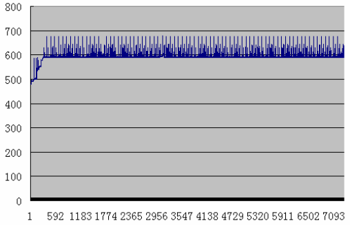 作者曾经用Robot 测试过网管软件的内存泄露问题,在这里列举两个进程占用内存的例子:其中第一个存在内存泄露,第二个没有内存泄露。图中纵坐标为内存的参考值(两个图形的参考值不同,所以差别较大),横坐标为采样点的个数。