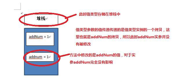 从结果中可以看出addNum调用方法之后它的值并没有改变,Add 方法的调用只是改变了addNum的副本addnum的值,所以addnum的值修改为2了。然而我们的分析到这里并没有结束,为了让大家深入理解传递传递,我们有必要知道为什么值类型参数的按值传递不会修改实参的值,相信下面这张图可以解释你所有的疑惑: