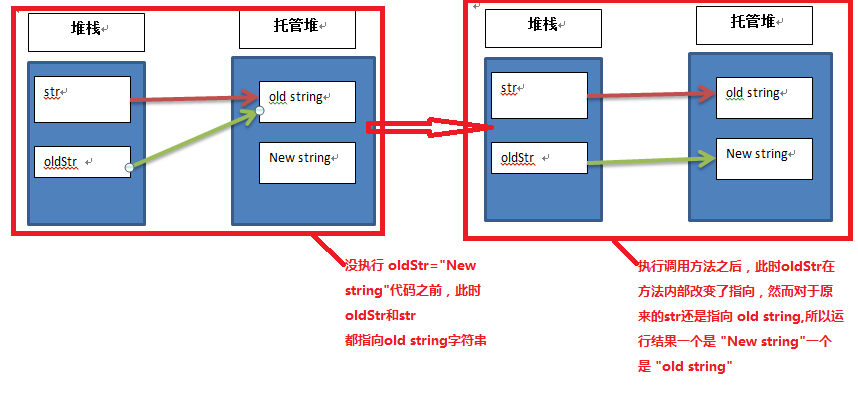 对于为什么原来的值没有被改变主要是因为string的“不变性”,所以在被调用方法中执行 oldStr="New string"代码时,此时并不会直接修改oldStr中的"old string"值为"New string",因为string类型是不变的,不可修改的,此时内存会重新分配一块内存,然后把这块内存中的值修改为 “New string”,然后把内存中地址赋值给oldStr变量,所以此时str仍然指向 "old string"字符,而oldStr却改变了指向,它后指向了 "New string"字符串。所以运行结果才会像上面这样,下面内存分布图可以帮助你更形象地理解文字表述: