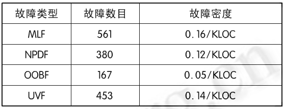 表2是对3197302行、美国生产的C++程序4类故障的测试结果。可以看出,4类故障总的故障密度为0.48/KLOC,也是说,大约2000行C++的代码有一个故障。