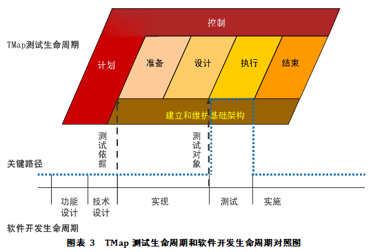 TMap测试生命周期与软件开发生命周期之间的关系取决于所应用的软件开发方法和相关测试级别。然而,有两个“固定”时间点有助于确定测试生命周期和开发生命周期的关系。一个是准备阶段的开始时间点与获得测试依据的时间点对应关系;另一个是执行阶段的开始时间点与获得测试对象的时间点的关系。具体时间点的对应关系参见下图。