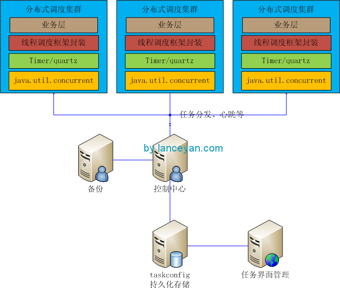 构建好线程调度框架是不是可以应对大量计算的需求了呢?答案是否定的。因为一个机器的资源是有限的,上面也提到了cpu是时间周期的,任务一多了也会排队,算增加cpu,一个机器能承载的cpu也是有限的。所以需要把整个线程池框架做成分布式的任务调度框架才能应对横向扩展,比如一个机器上的资源呢达到瓶颈了,马上增加一台机器部署调度框架和业务可以增加计算能力了。好了,如何搭建?如下图: