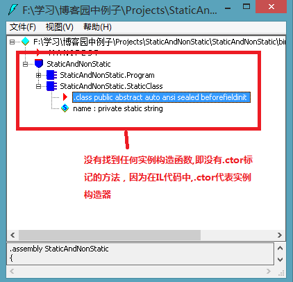 ● 静态类是不能实例化,之所以不能实例化,是因为静态类会导致C#编译器将该类同时标记为abstract和sealed,并且编译器不会在类型中生成一个实例的构造函数,从而导致静态类不能实例化,具体原因可以见下图;非静态类可以,并且静态成员的访问只能通过类来进行访问,因为静态成员是属于类的。