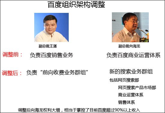 从邮件内容看,此前统领销售业务两年多的王湛调整为承担对个人用户收费进行探索。向海龙则从负责百度商业运营体系扩大到网页搜索部、网页搜索产品市场部、商业运营体系、销售体系等几大核心体系,其掌控的“搜索业务群组”已成百度内部的超级大部门,掌控百度超过90%以上的营收。