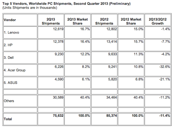 IDC公布的数据则显示,第二季度惠普的PC出货量同比下降近8%。IDC公布的前五大PC厂商排名与Gartner一致。