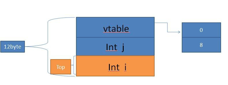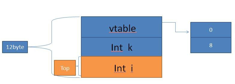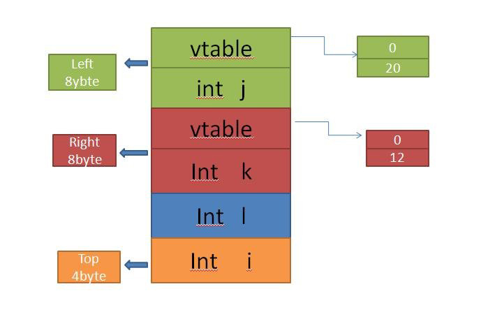 上面代码中,Left和Right类对象首地址处都含有一个vbtable(误写为了vtable)指针,指向一个vbtable,vbtable里面只有两项:第一项是vbtable指针所属类的虚表指针vptr(没有从对象首地址开始算)相对于vbtale指针的偏移量;第二项是其父类虚表指针vptr(没有的话是对象首地址)相对于vbtable的偏移量。