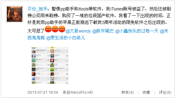 国内知名的应用社区爱应用(iapps.im)创始人邓靳沩透露,在收到网友反馈后,爱应用编辑组与网友详细沟通后发现,出现上述状况并非个例,而是普遍情况,事态已经相当严重。“我们每天使用的iTunes账号,可能变成了刷榜公司的直接帮凶。”
