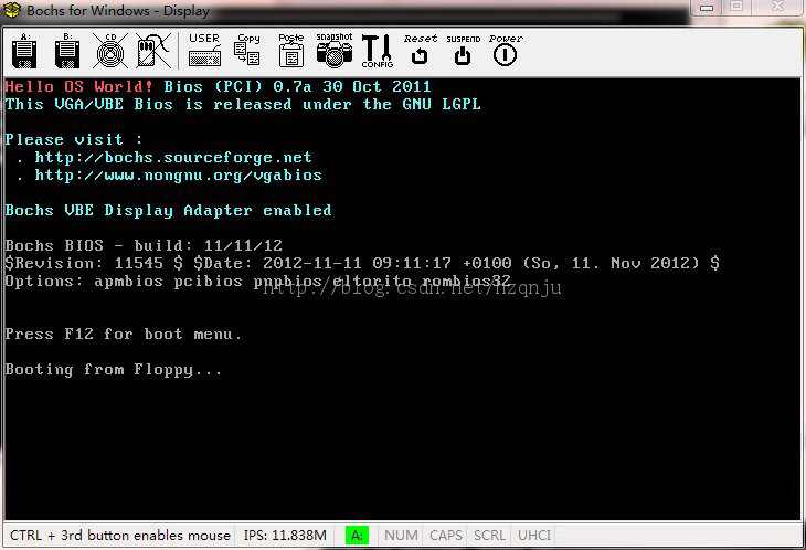 7. 双击bochsrc.bxrc,这时Bochs虚拟机启动,第一行显示:Hello OS World! 如下图所示: