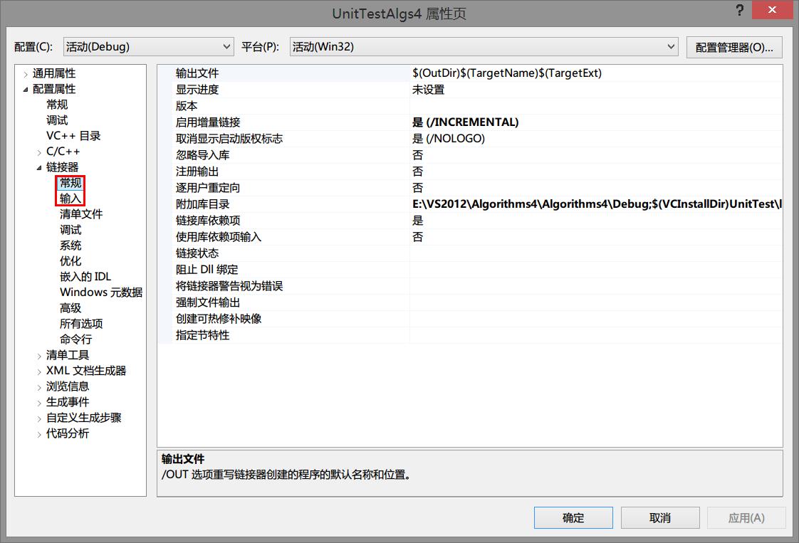 向附加依赖项中仅添加待测试函数的.obj文件名,这里是algs4.obj。