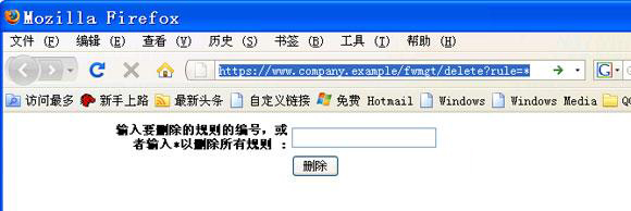 假设防火墙有一个基于Web的管理接口,我们称之为防火墙Web管理程序,其中具有一个这样功能或者说一个页面,即允许认证的用户通过规则编号删除指定的规则,或者通过输入“*”删除全部已配置的规则——这的确是一个非常危险的功能。该删除页面显示如下。假如该表单(我们已经对其进行了简化)引起一个GET请求,那么该请求将如下所示