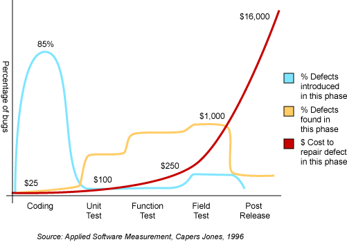 捕捉错误、问题和缺陷的佳位置是在开发周期的早期。图 1 展示了容易出现缺陷的地方,以及容易发现它们的地方,并包括了修复这些缺陷的成本(这些成本是针对 1996 年的 —— 的成本显然更高)。