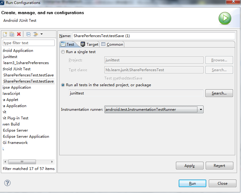 根据自己的程序,在AndroidManifest.xml文件中配置上面的信息。如果上面的信息配置正确,鼠标右键单击工程,选择Run AsRun configurations,在Android JUnit Test选项中选择工程,将会看到下面这个界面: