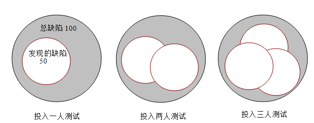 在时间一定有的情况下,投入的人员越多,发现的问题越多,从图中可以看出,投入的人员越多,人员发现缺陷的重叠度越高。当然,你可以说,把每个人员要测试的内容划分清晰不会重叠了。做为一个系统的各个功能模块,他们之间肯定存在必然的联系。有可能A人员在测试时会涉及到B人员测试的功能,并且发现了问题,不管是告诉B缺陷还是A人员直接提交缺陷(当然,你也可以装作没看到,等着B去发现),这都算不可避免的重叠。
