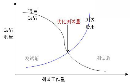 如上图所示,纵轴是表示缺陷的数量,横轴表示测试工作量。缺陷的数量随着测试工作的进展在不段减少;但测试有费用也随着工作量在不段提高。