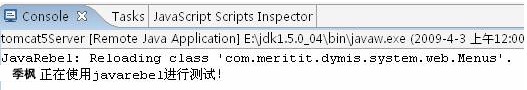 启动tomcat完毕后,修改java类文件。然后直接运行程序(不用重启服务器)。在myeclipe控制台会打印下图红色笔记部分信息,此为javarebel自动打印,告诉你被修改的类部署的部署情况。