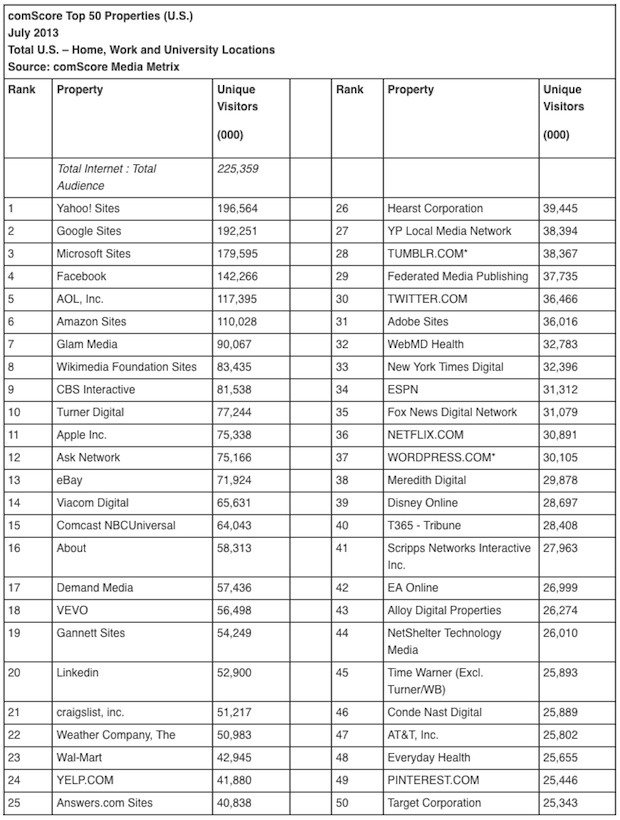 据统计,雅虎上月在美的独立用户访问量达到1.97亿次,高出谷歌的1.92亿次。排在三至五位的分别是微软、Facebook以及AOL。
