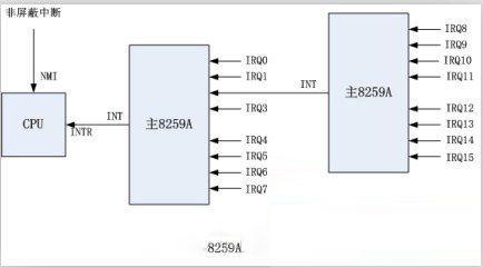 通过对8259A的配置,可将IRQ0~IRQ7对应到中断向量20h~27h,同样地IRQ8~IRQ15可对应到中断向量28h~2Fh。具体初始化配置代码不进行分析了。