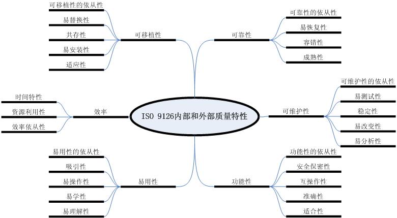 下图是ISO/IEC 9126质量模型中定义的内部质量和外部质量6大质量特性,每个质量特性又包含不同的之质量特性。ISO/IEC 9126质量模型可以为测试人员提供比较全面的质量特性,测试人员可以根据具体的项目和产品特点对这些质量特性进行裁减。