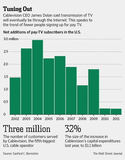 美国有线电视公司Cablevision Systems首席执行官詹姆斯·多兰(James Dolan)预计,电视节目的播放终将转向互联网。他说道,“可能会有那么”,这家公司将会停止提供电视服务,届时宽带将成为其主要产品。长期以来分析师一直都预测未来将发生这一转变,但多兰的这一言论可能是首次有一位有线电视公司首席执行官公开承认这种可能性。