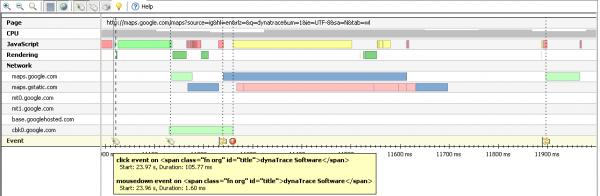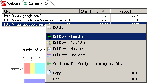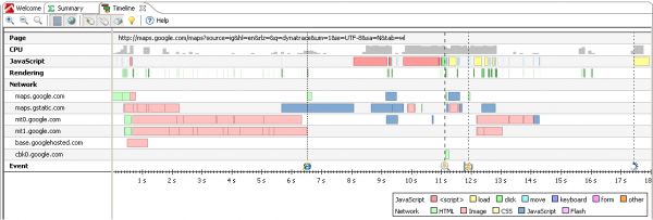 时间轴视图可以通过双击Cockpit面板中的Timeline节点打开,或者在Summary视图中通过在某个URL上点击右键,选择“Drill Down-TimeLine”打开。我们用这种方式打开maps.google.com页面: