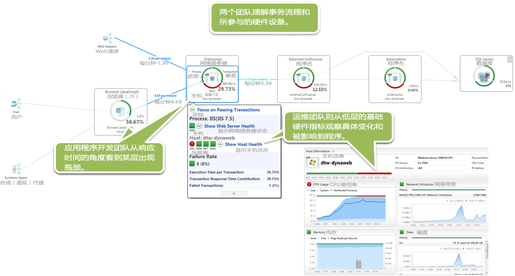 在测试过程中,运维团队和开发团队一起监控实时性能数据,当达到一定的负载水平后,我们看到终用户的响应时间和耗尽资源。在本次测试中非常有趣的是,开发团队和运维团队都看着相同的数据,但是却从不同的角度去审视这些结果。然而,他们都是依赖于近才公布的Compuware的PureStack技术,这是——整合dynaTrace和PurePath——的第一个解决方案,显示出在高负载下生产环境的硬件是如何影响到关键业务应用程序的性能。