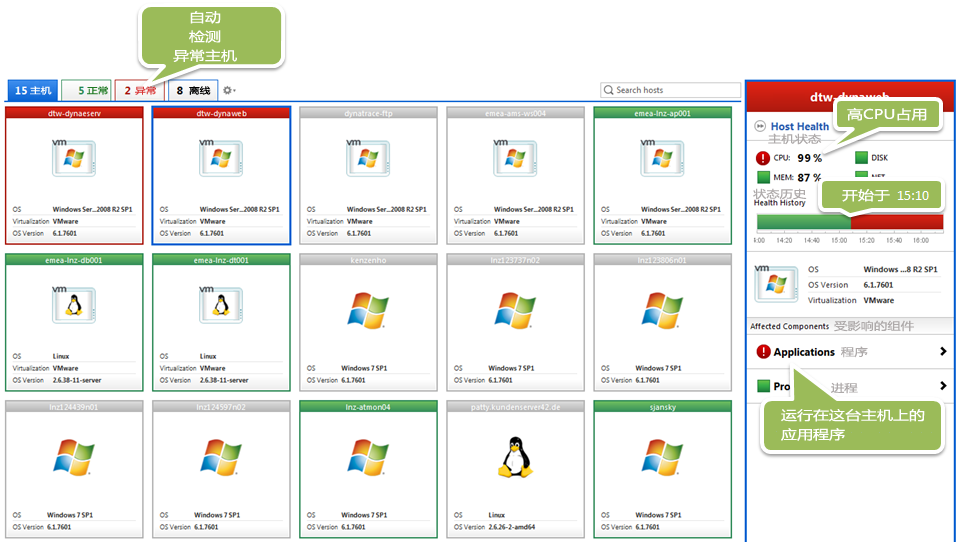 运维团队希望能够看着他们的服务器列表,而所有关键指标(CPU,内存,网络,磁盘等)都能很快地呈现出绿色状态(OperationsTeamslikehavingtheabilitytolookattheirlistofserversandquicklyseethatallcriticalindicators(CPU,Memory,Network,Disk,etc)aregreen)。但是,当我们的负载测试达到了顶峰时,他们看向服务器的状态时,显示出来却是,他们有2台机器正出现了异常: