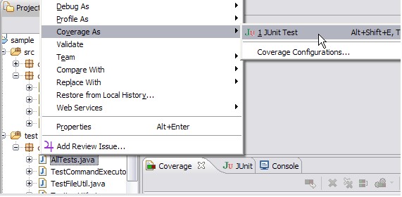 EMMA是一款比较流行的开源Java测试覆盖率分析工具,支持类、方法、代码行、基本代码块等多种类型的测试覆盖率分析,支持将覆盖率分析结 果导出为多种格式的报告,并采用多种颜色来高亮显示不同的覆盖率状态。EclEmma是一款基于EMMA的Eclipse插件,方便在 EclipseIDE中进行测试覆盖率分析。如图9,在测试用例写好后,可以在右键点击测试类,选择CoverageAs->JUnitTest。