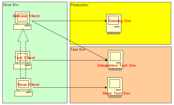 传统(目前)软件开发模式如图1,分为开发环境,测试环境,和客户运行环境。开发客户端(Deve Client)负责软件编码,并将代码发布到测试环境的开发测试机(Deve Test Env),该机可以被开发者访问更改。开发者可以在该机器进行初步的集成测试。当初步集成测试结束后,开发者向发布者(Release Client)提交集成测试申请,发布者将编译好的程序发布到集成测试机(Integration Test Env)。测试人员则在测试可客户端开始集成测试。当集成测试通过后,再由项目经理向发布者提交产品发布申请,终又发布者发布为产品。