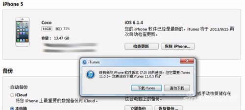 将手机连接好电脑,PC还是Mac无所谓,打开iTunes点“检查更新”,会看到这个界面: