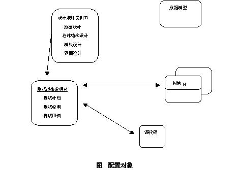 普遍认为,用面向对象的方法组织项目数据库自然、合理。此时,将每个SCI看作一个配置对象,它有自己的名字和一组属性,各SCI之间的联系用对象间的关系表示。以下图为例,“设计规格说明书”、“数据模块:”、“模块N”、“源代码”、和“测试规格说明书”分别为五个配置对象,对象之间的关系用有向连线表示。有向曲线说明对象的部分-整体关系。例如,“数据模型”和“模型N”都是“设计规格说明书”的组成部分。双向连线说明对象间的内在联系。例如,一个模块的源代码一旦变动对应的测试用例亦需修改,随之需要重新执行测试过程。