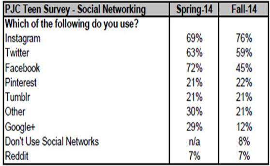 排名第二的是Twitter,覆盖率高达59%,但是令人不安的是,Twitter的覆盖率比年初下降了四个百分点。表明Twitter在青少年中已经成为一个“夕阳产品”。