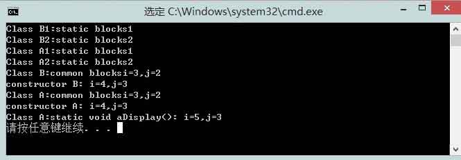 System.out.println("Class A:static void aDisplay(): "+"i="+i+",j="+j);