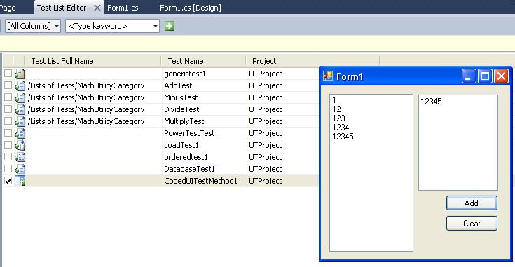 7.重新打开被测的Winform程序,然后在Test List Editor里面选择刚生成的CodedUITestMethod1方法,执行它。则被测Winform程序会自动执行刚才所录制的所有操作。