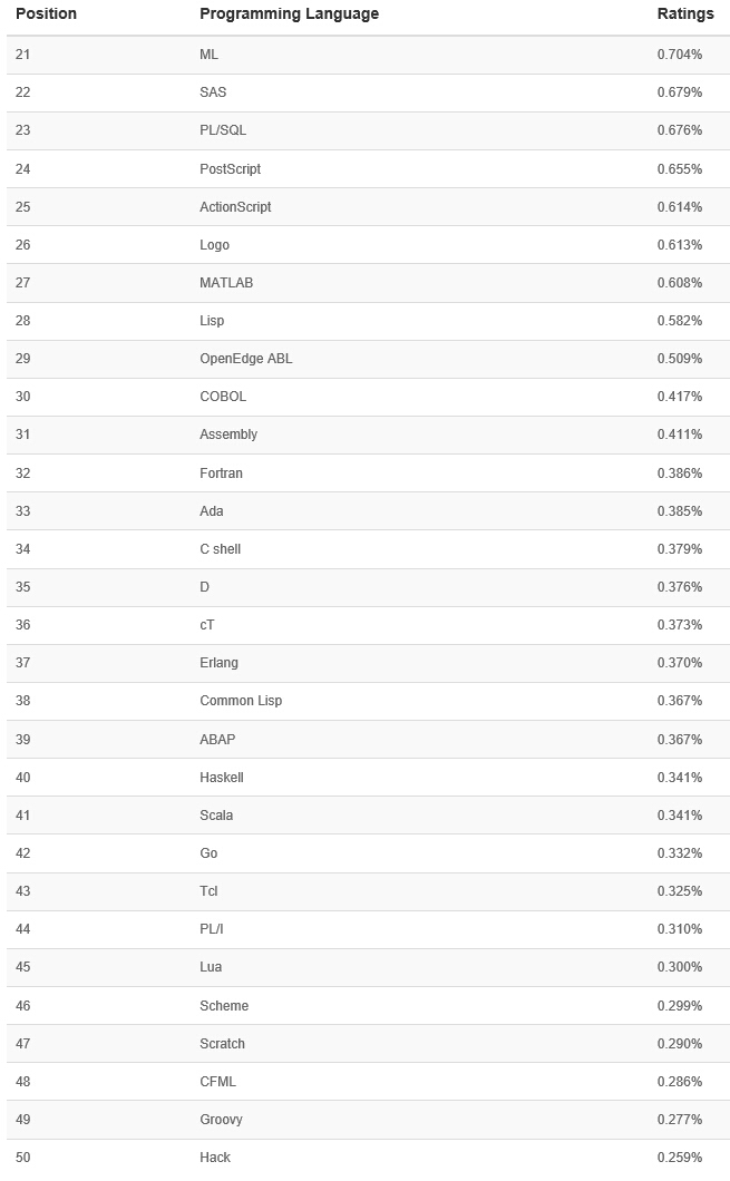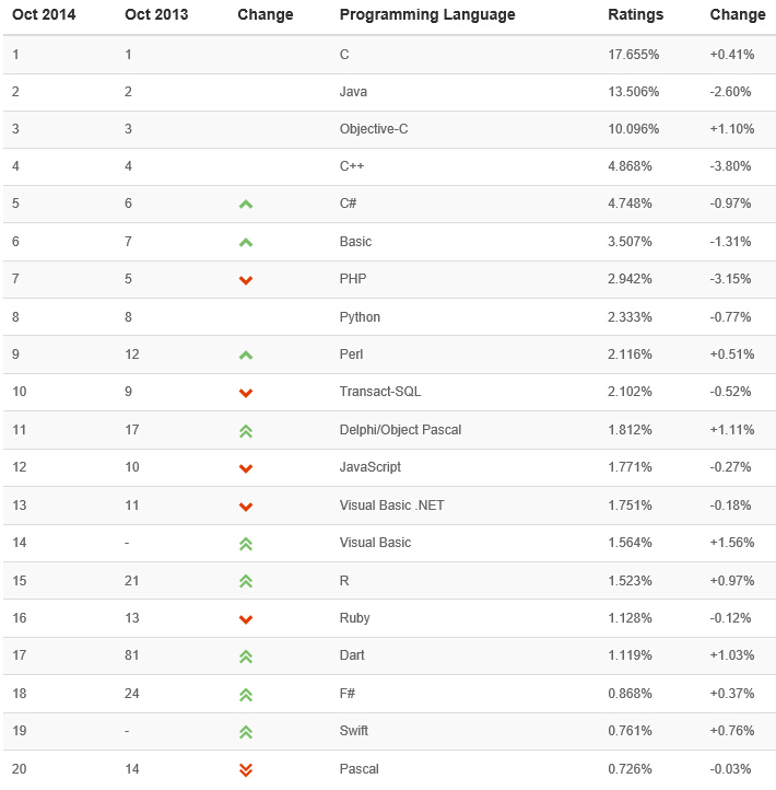 本月值得关注的是,Google Dart首次进入Top 20,排名在17位,是有史以来排名高的一次。从2011年发布至今,Dart的编译器已经成熟,并声称生成的代码比手写的JavaScript更快,这对于JavaScript来说似乎一场硬战将要来临。