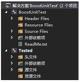 接下来,我们新建一个BoostUnitTest解决方案,然后在该方案下添加(鼠标右击解决方案新建项目)两个项目。第一个项目是空的“WIN32”项目“Tested”,另一个是“Boost Unit Test Project”项目(新建项目->模板->Visual C++->Test下)“BoostUnitTest”。如下图: