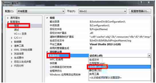 在这里,我们并不需要新建一个main函数对这个类tested进行测试(因为我们已经有单元测试了),但一个程序默认是需要main函数的,所以在需要在Tested项目属性中进行这样的设置(“配置类型”改为“动态库(.dll)”见下图):