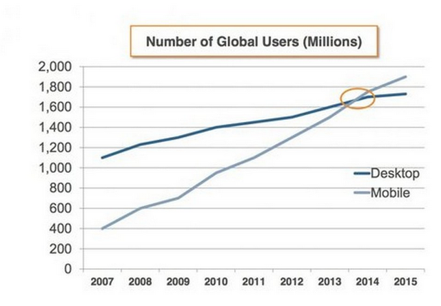 风投公司Andreessen Horowitz合伙人克里斯·迪克森(Chris Dixon)制作了两张图标,可以证明这个观点。第一张图表显示,2014年移动用户已经超过台式电脑用户。