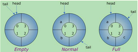 其中,为区分队空与队满,在入队时少用一个数据(图中下标为3的位置)。本文约定队首指针head指向队首元素,队尾指针tail指向队尾元素的下一个元素,以队尾指针加1等于队首指针判断队满,即: