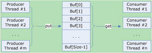 在多个进程间共享一个公共数据缓冲区需要某种形式的共享内存区(如存储映射或共享内存),而多线程天然地共享存储空间。为简便起见,本节的讨论于多线程。