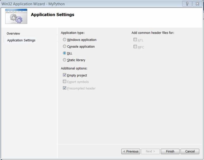 5.在MyApp解决方案里面新建一个win32 dll空项目名为MyPython。