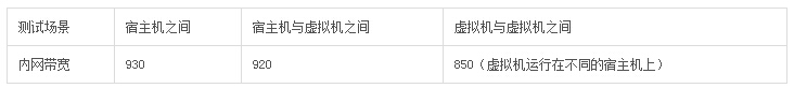 下面是一个可供参考的测试结果。在这个测试中使用了两台物理机,每台物理机各配置一颗Intel Core i3 540 @ 3.07 GHz (双核四线程),16 GB内存(DDR3 @ 1333 MHz),一块Seagate ST2000DL003-9VT1硬盘(SATA,2TB,5900RPM),运行Ubuntu 10.04 AMD64 Server操作系统,使用的文件系统为ext4,使用的Hypervisor为KVM(qemu-kvm-0.12.3)。我们分别测试了宿主机之间、宿主机与虚拟机之间、虚拟机与虚拟机之间的内网带宽。虚拟机的配置为2 颗vCPU(占用两个物理线程,也是一个物理核心)和4 GB内存。虚拟机的配置为2 颗vCPU(占用两个物理线程,也是一个物理核心)和4 GB内存,运行Ubuntu 12.04 AMD64 Server操作系统。在这个测试中没有对操作系统、文件系统、NFS、KVM等等进行任何性能调优,但是虚拟机的网卡启用了virtio。