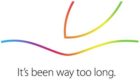 这封邀请函上的图案是苹果Logo顶部的特写,跟近该公司发布iPhone 6以前发出的邀请函上的图案类似,只不过这一次的图案是彩色的,并且附有“久违了(It’s been way too long)”的标语。