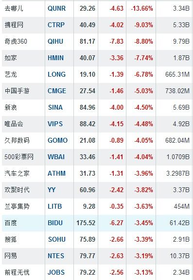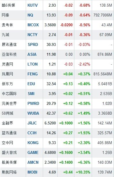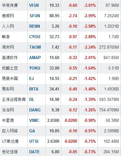 其余个股中,奇虎360跌8.80%,如家跌7.74%,艺龙跌6.78%;斯凯网络逆市涨10.35%。中国概念股周四收盘行情如下:
