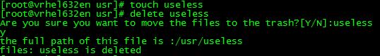 运用 delete 脚本删除文件,例如要删除在/usr 目录下的 useless 文件。根据用户目前所在的位置,可以用相对路径或路径来指定参数,如:delete useless,delete ./useless 或者 delete /usr/useless。执行过程如图 1 所示: