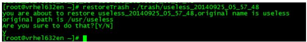 如果用户在七天之内发现该文件还有使用价值,则可以使用 restoreTrash 命令将被删除文件恢复到原路径下:restoreTrash ~/trash/useless_20140923_06_28_57。具体执行情况如图 4 所示: