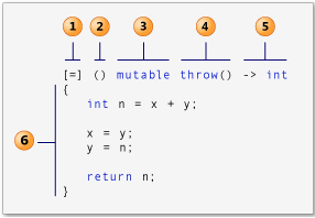 这里假设我们定义了一个如上图的lambda表达式。现在来介绍途中标有编号的各个部分是什么意思。