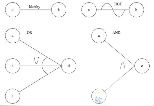 设想一下,每个结点的值为0或为1,0表示“不存在”状态,1表示“存在”状态。identity函数表示,如果a等于1,则b也是1,否则b为0.not函数表示如果a等于1,则b为0,否则b为1.Or函数表示如果a或b或c等于1,则d为1,否则d为0。and函数表示如果a和b都等于1,则c为1,否则c为0.
