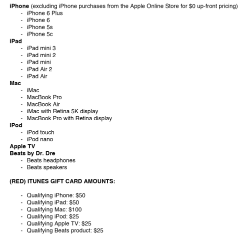 今年苹果的促销力度与以往相比要大了一些,畅销的iPhone智能手机也加入了进来,包括iPhone 6、iPhone 6 Plus、iPhone 5s及iPhone 5c等,所有购买iPhone的消费者都会获得面值50美元的iTunes礼品卡返还。另外,相同的优惠活动也覆盖到了包括iPad Air 2、iPad Air、iPad Mini 3、iPad Mini 2和iPad Mini等平板电脑,消费者同样会获得50美元的礼品卡赠品。