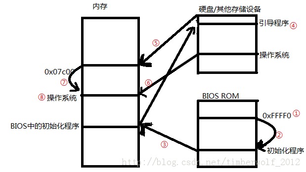 0xFFFF0中这条跳转指令,跳转至BIOS ROM的某个地址,从这开始是一段初始化程序,把这段程序复制到内存中执行。