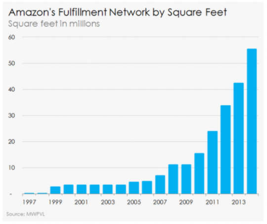 扩张为亚马逊带来了实质性优势,公司把握住了每个城市的零售市场增长机遇。而其中为重要的一点,亚马逊为在线消费清除了一个主要障碍:配送的即时性。